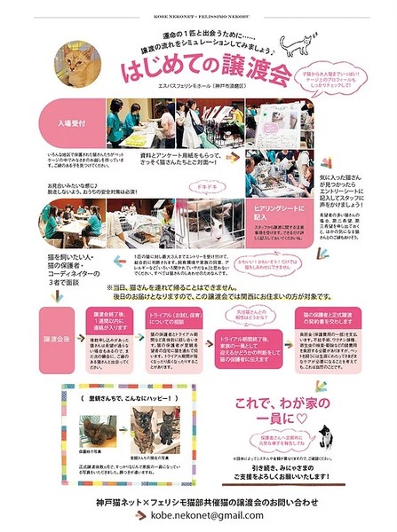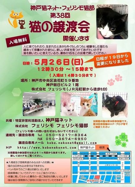 | 里親募集する理由 | 一人暮らしのおじいさんが内外飼育しており、ボランティアさんがTNRする つもりで入っていましたが、いつの間にか台所のシンク下で出産してたそうです。 おじいさんは引っ越しするので引き取れないと 言われ親子で保護しました。 譲渡会に参加予定です。譲渡会以外でも保護宅でお見合い可能です。 子猫は来月末からの参加になります。 ☘️☘️☘️第38回 猫の譲渡会のお知らせ☘️☘️☘️ 2019年5月26日(日) 19日から変更になりました 2:30~15:00(入場は14:30まで) 会場:神戸市中央区浪花町59番地 神戸朝日ビル21階 株式会社 フェリシモ(JR元町駅から徒歩5分) ※ 会場に駐車場はありません。近隣の有料駐車場をご利用ください 共催 特定非営利活動法人 神戸猫ネット 株式会社 フェリシモ フェリシモ猫部 |