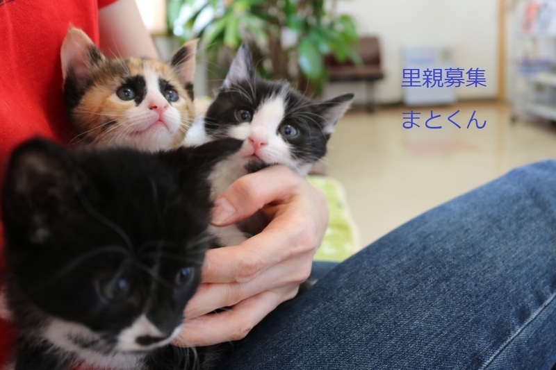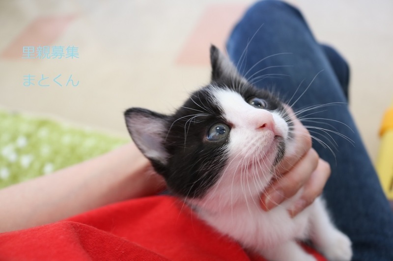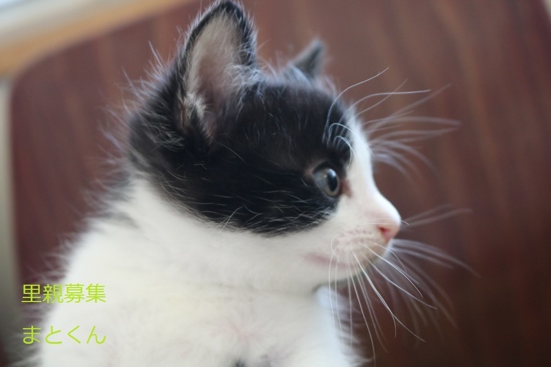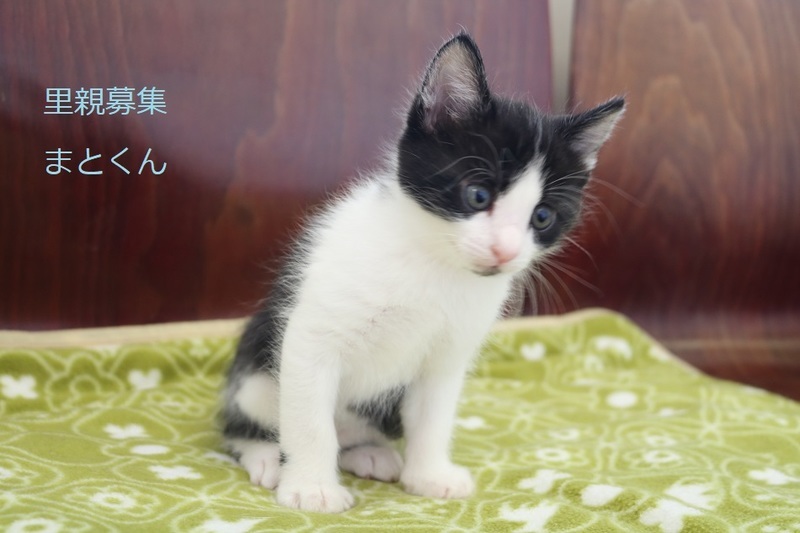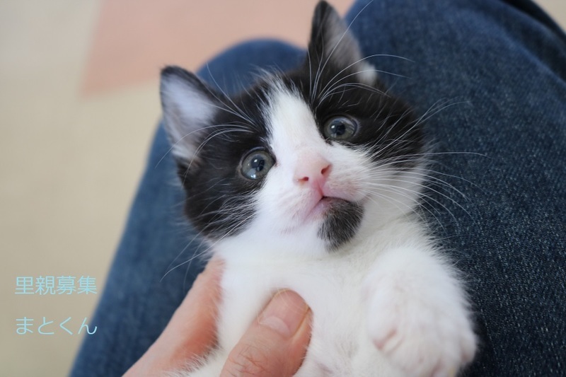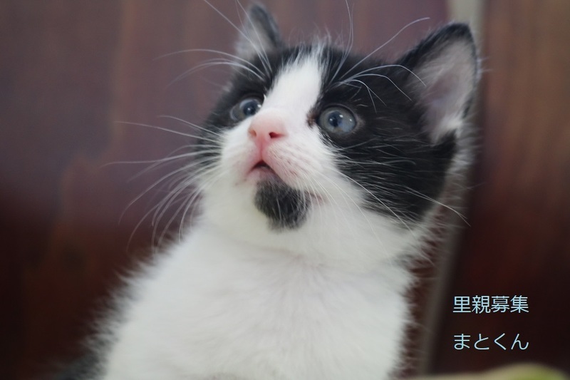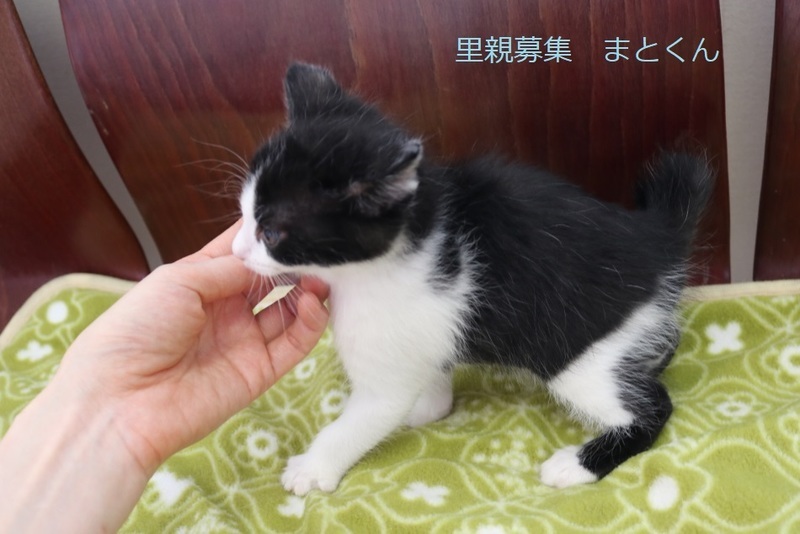 | 特徴(性格など) | 白黒仔猫、男の子、仮名:まとくん 推定生後1か月、体重:660g(5/25現在) 健康診断済み、駆虫済み、 血液検査-エイズ・白血病-陰性(5/23-兄弟代表で三毛ちゃんで実施) ワクチン近日予定、 トイレしつけ済み、 おっとりした性格の元気な男の子です。 兄弟仲良く遊んでいます。 6/14,初回三種混合ワクチン接種済み。 |