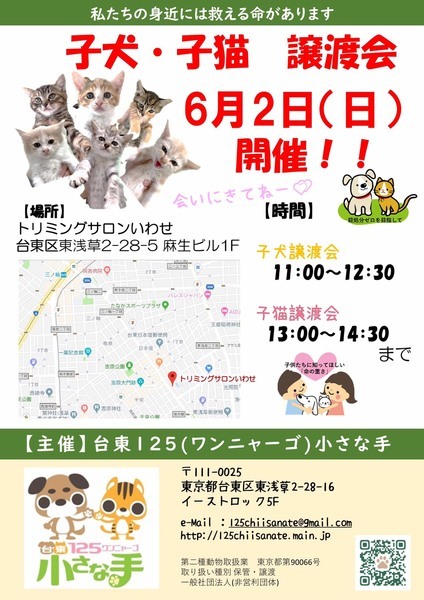 | 里親募集する理由 | 代理投稿 まだ生後2ヶ月位、可愛いチビ子猫達♂♀の里親様を募集しております! この子達は保健所に収容され殺処分寸前だったところをレスキューされ【一般社団法人台東125小さな手】のシェルターへやってきました。 中にはまだ少し警戒が見られる子も居ますが抱っこも出来ますし皆とても愛らしいです。 現在東京都台東区のシェルターにて、仲間達と元気いっぱいに素敵なご縁を待っています! ☆6/2日曜日、11時から12時半までの1時間半、譲渡会を開催致します。予約の必要はありません。是非可愛い子達に会いに来てください(^^) ※譲渡会参加予定は10匹位ですが体調などにより増減する場合がございます。 開催場所:台東区東浅草2-28-5 麻生ビル1階 【トリミングサロンいわせ】 どうぞ宜しくお願い致します(^ ^) |