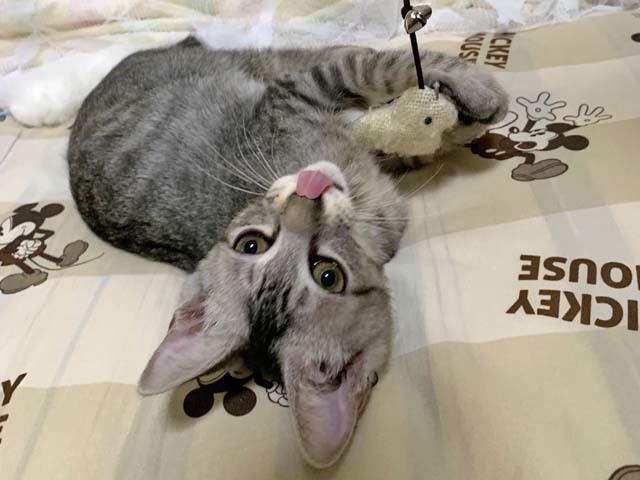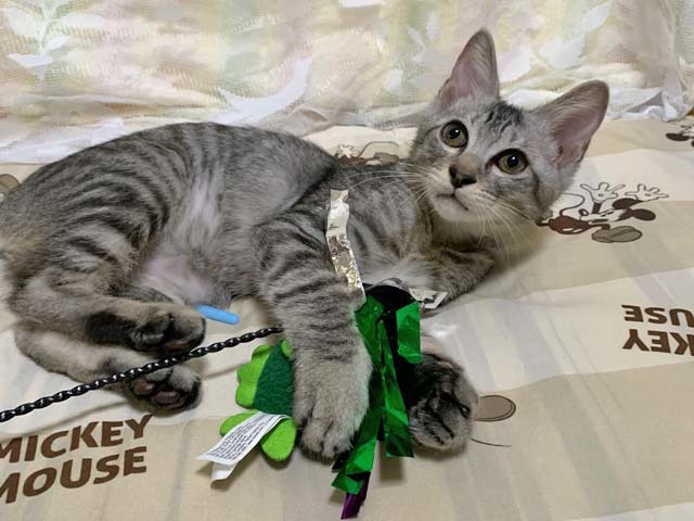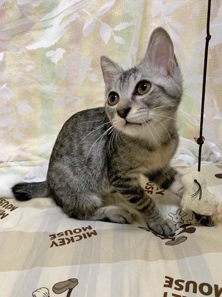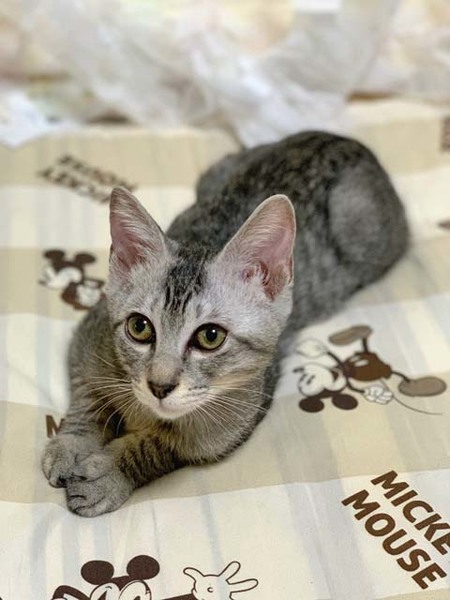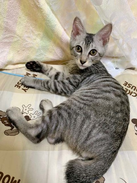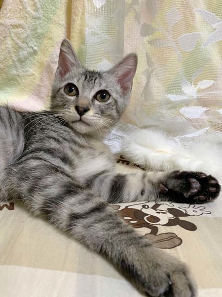 | 特徴(性格など) | くりくりお目々が愛らしい青葉(あおば)くんです。 体はふわふわ綺麗なサバ柄で、胸と口周りは少しクリーム色が入っています。女の子のような甘いお顔のイケメン君です。 子猫らしく元気いっぱいで、猫じゃらしにも素早く飛びつきます。 とっても甘えん坊で、しっぽをプルプルふるわせて甘えてくる姿がとても可愛いです。 目が合うと可愛い鳴き声で呼んできて、抱っこやなでなでを催促します。 赤ちゃん抱っこで眠るのも大好きで、お腹をなでなでしても起きません。 人の手で育てられましたので、人間大好きな子に育ちました。 しっぽは短め、ちょんもりした鍵しっぽです。 食事は子猫用フードやパウチを1日3回です。 トイレも失敗無く出来ています。 子猫は体調が急変したりして何が起こるか分からない為、お留守番の少ない、小さなお子様のいないご家庭を希望します。 終生完全室内飼育と、定期的なワクチン接種、避妊去勢などの健康管理をお願いします。 |