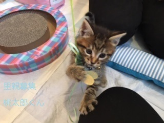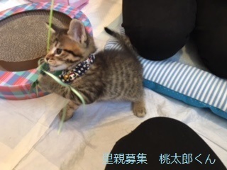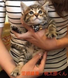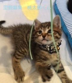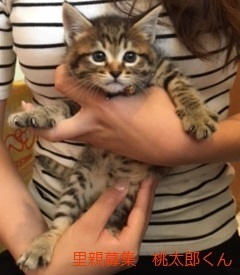 | 特徴(性格など) | キジトラ仔猫、男の子、仮名:桃太郎くん 推定生後一か月半くらい、体重:500g(5/18現在) 健康診断済み、レボリューション済み(5/18)、検便(5/29)、 血液検査-エイズ・白血病-ともに陰性(6/2)、 初回三種混合ワクチン接種済み(6/2)、 トイレしつけ済み、 同時に保護した兄弟と思われる子猫と一緒によく遊んでおり、今の所、健康状態に問題ありません。 |