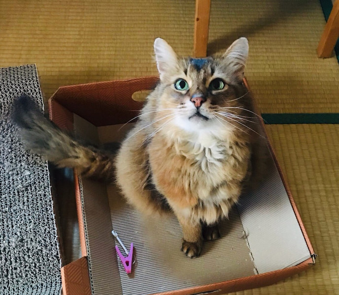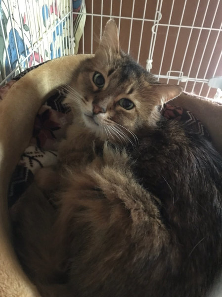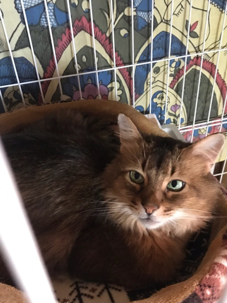 | 特徴(性格など) | ボクは、たぬ吉という新しい仮名を付けて貰ったよ ボクの元飼い主さんに子供が産まれてからかにゃ?その頃から何だかボクは、冷たくされ続けたんだ。 そして、それはあくる日のことだった。 知らない人が突然やって来て、ボクはお外に放り出されたんだ。 ボク、すごくすごく、怖かったんだ。 元飼い主から言われたのは、ボクが子供に危害を与えるからなんだって。 そんな事を言われて、ボクは、とってもとっても悲しかったんだ。 ボクは、そんな悪い子じゃにゃいのに。本当のボクはね、食いしん坊で甘えん坊にゃんだよ。 ボクを心から愛してくれる人には、ボクは絶対に危害なんて与えにゃいよ。 ボクは、ただ、愛が欲しいだけにゃんだ。 ---------------------------------------------------------- たぬ吉くんは、ソマリというイギリス原産の血統書の猫ちゃんです。 食いしん坊で、甘えたい時にだけ甘えたい!そんな猫ちゃんです。基本的には、人が大好きです! ソマリの特徴としては、大変頭が賢いということです。 それは、以下に保護した経緯などを詳しく書かせていただきます。 たぬ吉くんは、数年前に元飼い主から、子供に危害を与えるとの理由からお外に追い出され、捨てられたのでした。 理由は、子供を噛んだから?と私達は聞いておりますが、なぜか?送られて来た動画は、穏やかに子供に寄り添っているたぬ吉でした。 そして、その動画の場所は、近所の公園でした。 ですから、この子を外に追い出した元飼い主の証言は信じておりません。 追い出された臆病なたぬ吉は、どこにも行けず、家の前の小さな公園で、飼い主が外に出てくるのだけを楽しみに、 約4〜5年間ひとりで過ごしていたのです。 ご飯は驚くことに、近所の住民宅から貰って、長年を生き抜いておりました。 臆病な子なので、お外では喧嘩に負けてしまいます。 保護した時も、他の猫に攻撃された大きな傷が胸にありました。 とても痛々しく肉が見えていた状態ですが、預かりさんの献身的な介護ですっかりキレイに完治しました。 因みに、右耳が少し傷ついているのも、他の猫に引きちぎられそうになった傷跡です。 外には、怖いものがいっぱい。 その中で、懸命に生き抜いてきた たぬ吉の猫生は、彼にとって波乱万丈でした。 そんな理由から、たぬ吉は、恐怖を感じると、怯えて自分を守ろうと、手足を振り回します。 特に、人の手が自分の頭の上に来るのを怖がります。 心に傷を追っているからです。 しかしながら、きちんと信頼関係ができれば、たぬ吉は、とても甘えん坊になります。 たぬ吉は、8歳と高齢ではありますが、まだまだ心は赤ちゃんのままです! 本当は、甘えたいのに甘えられない猫生を取り戻すかのように、無邪気で子供っぽい子で、甘えてくる仕草は、とてもかわいいです! 甘えるときも、自分からすり寄って行くのは大丈夫ですが、完全に慣れるまではこちらから積極的に撫でようとすると「シャー」と、 手が出てしまう事もあります。そんな感じで、繊細で不器用なたぬ吉です。 最初は手がでてしまう事もありますが、環境に慣れたら落ち着いてきます。 慣れるまでは、またたびをふりかけてあげるのも効果的です! シーバとちゅーるが大好きです。 猫のおもちゃで遊んでもらうのが大好きですから、オヤツで釣られてしまう単純さもあり。 慣れるとどこまでも付いて来るような子です。 お留守番は、問題なくできますのでお仕事をおもちのご家庭でもOKです。 はじめは、ケージ飼いからスタートしていただきたいと思っています。 ケージに入っていると安心しますし、ケージは当会から貸し出しも出来ますので、ご安心ください。 以上が、たぬ吉の紹介で、ここからは、たぬ吉の心臓についてお話させていただきます。 たぬ吉を保護した時に発覚した「肥大心筋症」 動物病院にて、レントゲンの結果、肥大型心筋症が判明しました。 鎮静をかけていた為、超音波の検査はできませんでした。(心臓の動きが正確に出ない為) たぬ吉は、心臓の壁が厚くなり、血液の循環が悪くなっていました。 体が循環を良くしようと心拍数を上げてしまうため、心臓の動きが早過ぎてしまうので、しっかり循環できなくなっている状態です。 それを、アーチスト(薬)で心臓の動きを遅くし、血が溜まってから血液を押し出す調整をしています。 現在は、アーチスト 1日1回(1/4)錠 今後、症状が悪化した際は、服薬が増える可能性があります。 今の所3ヶ月に一度の通院が望ましいが、パニックを起こしてしまうのでお薬のみでも可です。 たぬ吉は、とても頭のいい子なので、自動車や待合室では落ち着いていても、診察室に入った途端に大暴れしてしまいます。 ですので、鎮静をかけないとレントゲンを撮ることができません。 先生との相談で、食欲もあり、元気があるのなら、わざわざ鎮静をかけてまで検査しなくてもいいです。との事で、お薬の処方のみになっています。 そして、たぬ吉は、便が詰ま