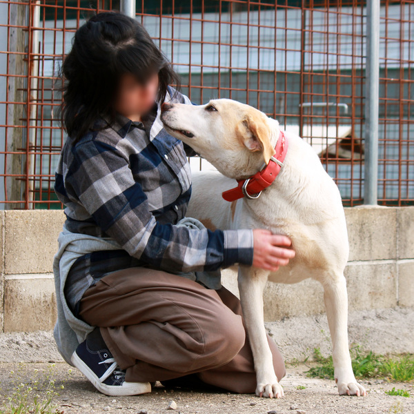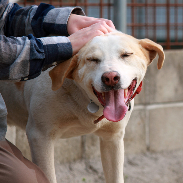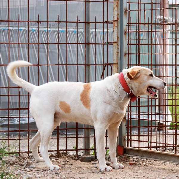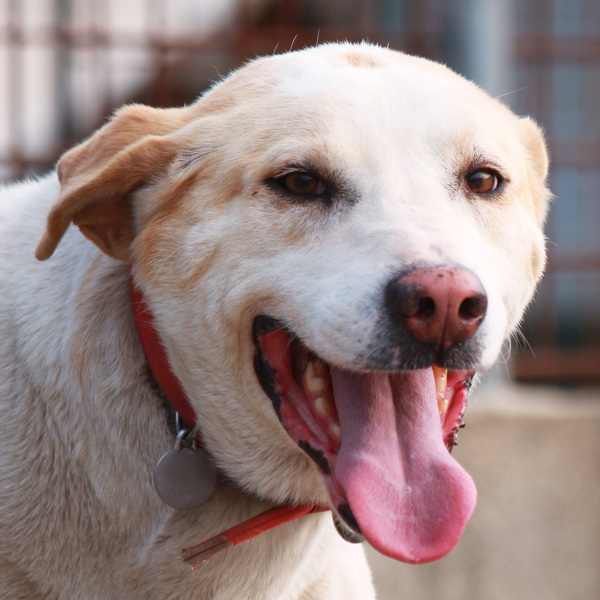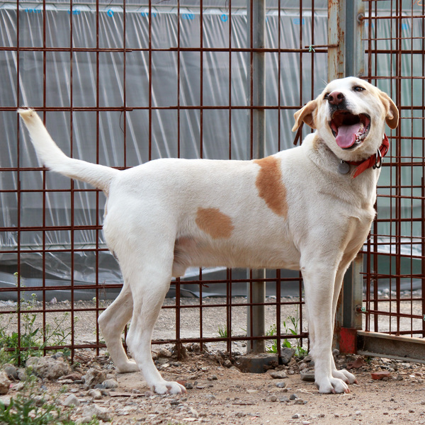 | 特徴(性格など) | 毛色は白地に薄い茶色(レモン?)の斑。 人にも犬にも優しくとても良い子ですが、元気一杯で体重35キロの大型犬ですので、体力のある方に向いています。 |