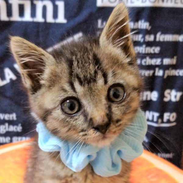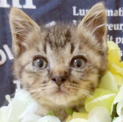 | 特徴(性格など) | 全身キジ柄で、尻尾は短いです。 きょうだいがいない状態で保護されたため、人間に対してかまってほしい甘えん坊です。 1頭での譲渡も可能ですが、猫の社会性を育てるため、しょうくんとペアでの譲渡だと嬉しいです。 一緒に遊ぶことで、力かげんなどを学び、よい子に育ちます。 |