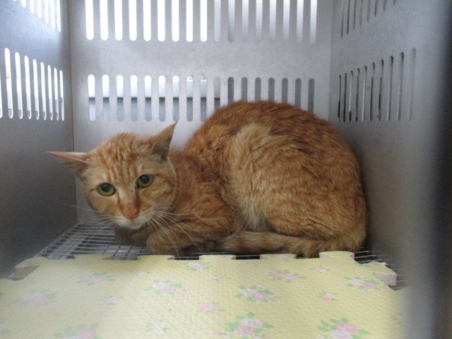 | 特徴(性格など) | 管理番号183 性別、年齢不明。 周南市西松原にて捕獲された茶トラ猫ちゃんです。収容されたばかりですので、緊張して過ごしております。 ※センターでは猫の捕獲はしておりません。 この子の状況をご理解の上、温かいご縁をお待ちしております。 フードは食べているようですが、現在センターに収容されているため、詳しい検査はできません。お迎え後は、かかりつけの病院にて受診をお願い致します。 ※尚、エイズ、白血病の検査もセンターでは行っておりません。また、募集する側も引き出して検査などに連れて行くことはできません。病気が気になる方のご応募はご遠慮下さい。 |
