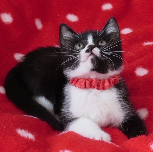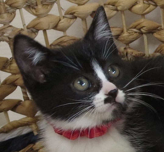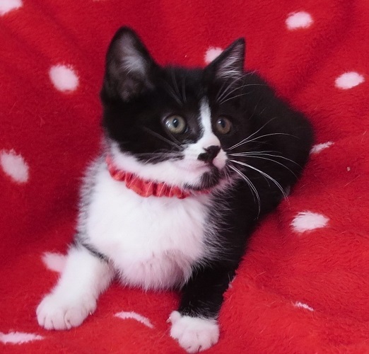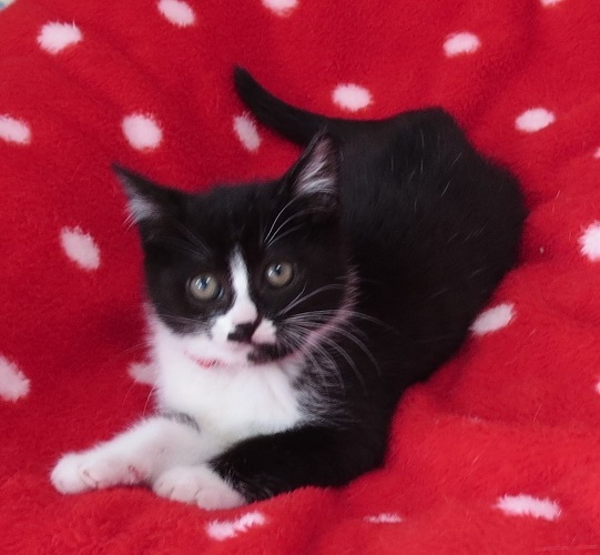 | 特徴(性格など) | 黒白の女の子3匹と、黒の男の子の4匹兄妹です。 兄妹でよく遊び、撫でるとゴロゴロ言っていますが、まだ小さいので性格はまだ判りません。飼って下さる飼い主さまの元で、可愛がって頂きながら出来上がっていくと思います。 心ちゃんは女の子らしからぬ顎鬚ガールで、一見山賊か暴走族の面構え。 でも本人は気にすることなく、一生懸命遊んでいます。 |