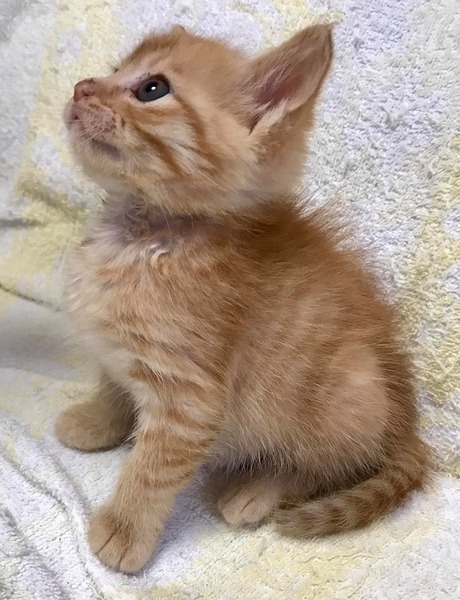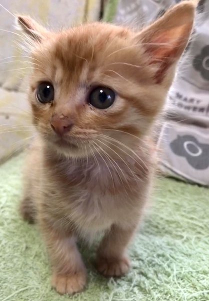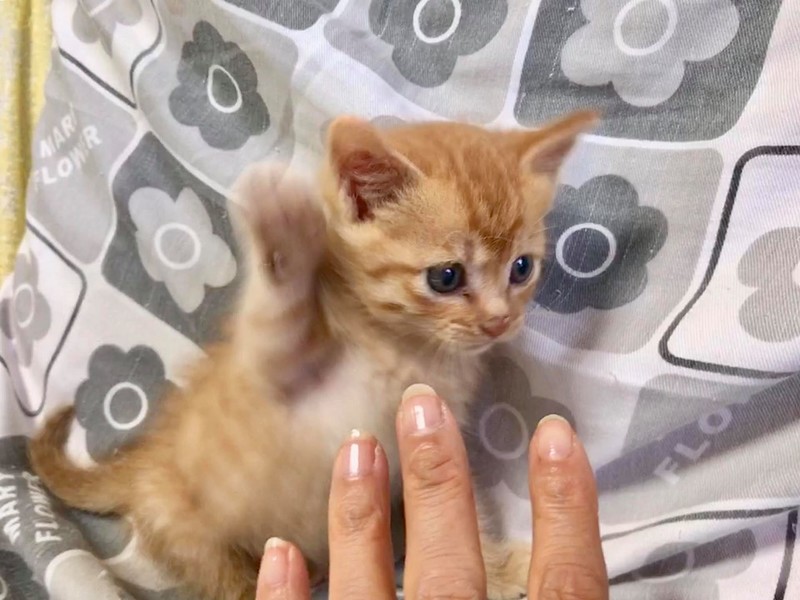 | 特徴(性格など) | 珍しい茶トラのメスです。 とても元気に遊んでいます。 動物病院で健康診断済み。 とても元気でかけずりまわっています。 現在生後1ヶ月弱。離乳が始まり、トイレトレーニング中です。 白ベースで茶が入ったメスの茶白の猫は多いのですが、完全な茶トラのメスは珍しいです。 とても綺麗な茶トラで、尻尾も折れてなく短くもなく、大人になったら綺麗な長い尻尾になります。 |