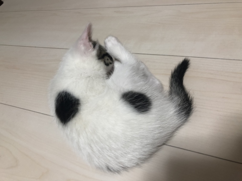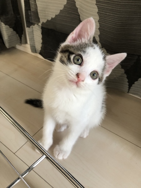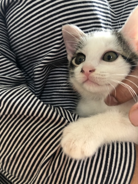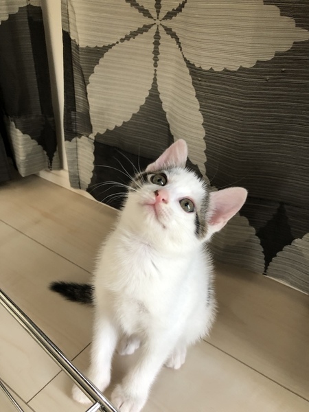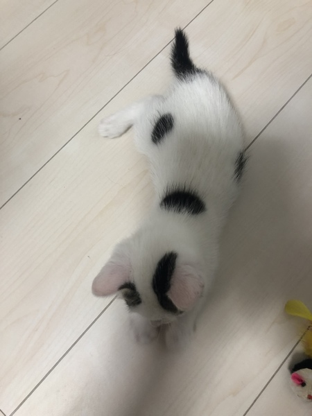 | 特徴(性格など) | 白地に黒縞の水玉模様がチャームポイント。 遊び盛りで元気、人間を怖がらず膝に乗りたがります。 ご飯をたくさん食べて、トイレトレーニングも出来ています。 血液検査も問題無しでした。 |