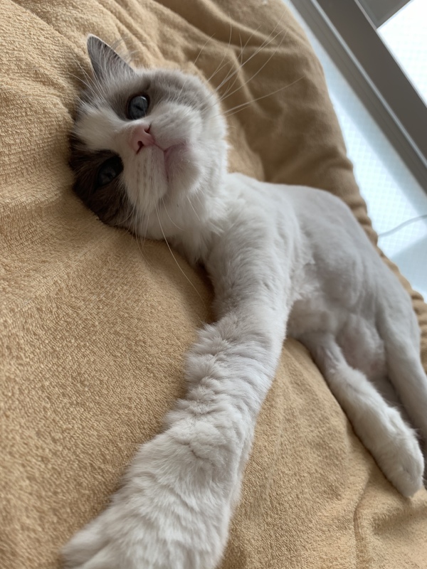 | 特徴(性格など) | 毛が白くて目が青くて とっても可愛い猫ちゃんです。 毛玉が出来やすいので、短くトリミングしてもらいました。性格は甘えん坊でとってもやんちゃです。ご飯と遊ぶのが大好きです。 |