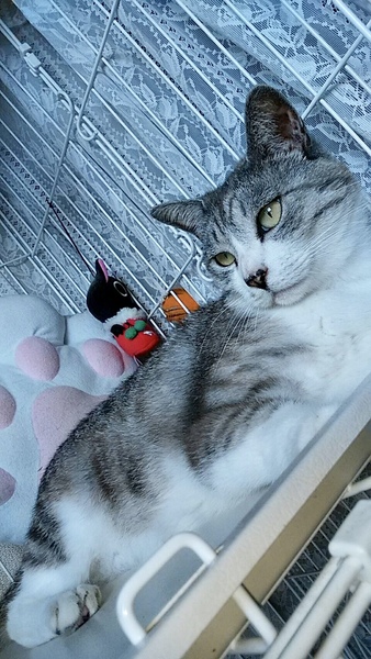 | 特徴(性格など) | 甘えん坊で、撫でてと鳴きながら擦り寄ってきます。 元気できれいなサバ白の男の子です。 |