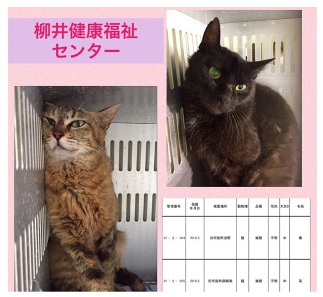 | 特徴(性格など) | 山口県の柳井健康福祉センターに2匹の成猫ちゃんが収容されました。どちらも少し長めの毛でモフモフした黒ちゃんとキジちゃんです。 住民の方に無理矢理捕獲され、とても怯えています。 突然収容され、可哀想にビックリする程狭い檻に閉じ込められ、相当なストレスでしょう。胸が痛いです。どんなに辛いでしょうか。 でもお迎えが無い限り、出られることなくセンターへ移送されてしまいます。 今のところ威嚇や攻撃などはありませんが、怯えて不安いっぱい、ジーっと大人しく、固まっている状態です。 男の子か女の子か、センター職員さんがまだ確認出来ず恐縮ですが、どちらでも構わないよ、馴れるまで長い目で見守っていけるよ、と仰ってくださる方、どうぞ宜しくお願い致します!! この子達は何も悪くありません。どうか温かい家族に出会えますように。。 良いご縁を頂けます様に! 家族を必要としています。のびのびと遊んだり、抱っこされてスリスリ甘えたりさせてあげたいです。 過酷な環境の中を懸命に生きてきてくれたこの子達に、どうか温かい手を差し伸べて下さい。 安心出来る、愛してくれる温かい家庭、当たり前の幸せを知ってほしいです まだまだこれからの命を、絶対に幸せに過ごしてほしいと願っています。どうか宜しくお願い致します家族の一員に迎えて頂けませんか。 良いご縁をお待ちしております。 ◆健康状態 センターでは収容するのみになり、健康診断やワクチンなどは一切行っておらず、収容動物の健康面の保証、及びトライアルはございません。 エイズ、白血病の検査もセンターでは行っておらず、引き出して病院へ検査などに連れて行くことは出来ません。 お迎え後は直ぐに、ノミダニ駆除を含め病院でメディカルチェック、混合ワクチン、適期での不妊手術を確実にお願い致します。 去勢、避妊手術は譲渡条件の1つになります。 (診断書の写メなどをご提出頂きます。) また、例えどんな病があろうとも最期まで責任を持って家族として迎えて下さる覚悟のある方でないと保健所収容の猫ちゃんの受け入れは難しいです。 全てを受け止め丸ごと受け入れて下さる方、終生愛情飼養して下さる方のみ への譲渡となります事をご理解、ご了承の程何卒宜しくお願い申し上げます。 ◆ワクチン摂取、去勢手術の有無 不明です |