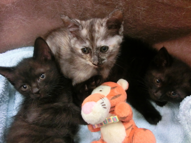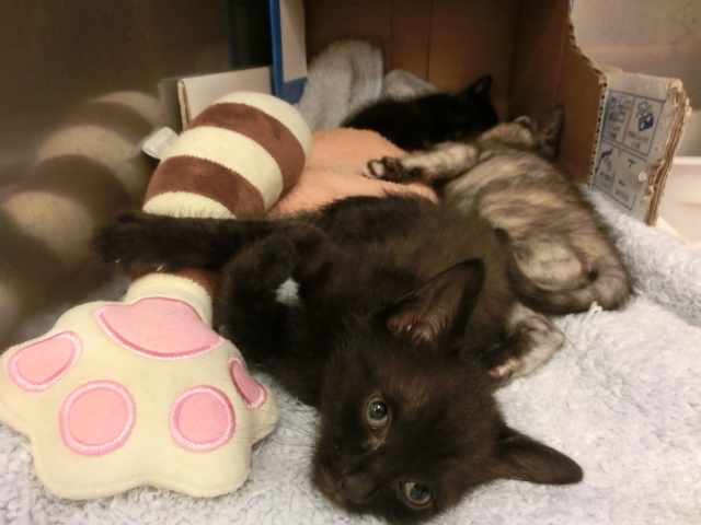 | 特徴(性格など) | あるお宅の庭で生まれた子猫兄妹です。 今現在病院にいますが、とても人懐こい子猫達になりました。 母猫のミルクを飲んで育ったようで、元気でよく食べ、よく遊び仲良しの兄妹です。 トイレもきちんと出来、ご飯も1人でキレイに食べれる2ヶ月くらいの子猫達です。 シャンプー・爪切り・ノミダニ虫下し処置は済んでいます。 ワクチンはまだ小さいので、時期を見て打ちたいと思います。 薄い柄のサビちゃん(ゆうちゃん)女の子・黒の顔が丸い女の子(しずちゃん)・黒の男の子(りょう君)みんな体重650g |