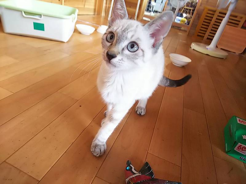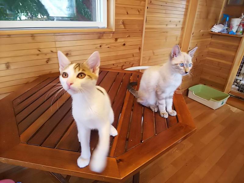 | 特徴(性格など) | 生後4ヶ月 シャムMix♂ マイペースでおっとりとしています。遊び好き。 白きじ♂ 元気一杯、とても甘えん坊さん、抱っこするとゴロゴロ言って、可愛いです。 食欲旺盛。風邪もひいていません。 |