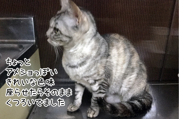| 特徴(性格など) | サバトラというんでしょうか、モノトーンぽいしましまに、うっすら茶色が入っています。撮影の間もずっとおとなしく落ち着いて座っていてくれました。穏やかな雰囲気の子です。 | ||