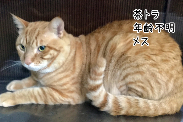 | 特徴(性格など) | 獣医さんにも年齢は分からないとのことですが、おそらく一緒に保護された4匹の猫の母親ではないかという話です。大きめですが茶トラらしくおっとりしていて、のんびりおとなしい性格です。 | ||