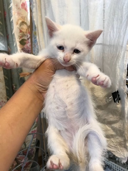 | 特徴(性格など) | 6/7に保護しました。 生後2ヶ月程かと思われます。 雪のような真っ白な毛に、青い目が特徴の可愛い子猫です。 “姫ちゃん”は施設名です。 隔離期間中の為、エイズ&白血病の検査はしておりません。現時点だけでも知っておきたいと言う里親様には料金ご負担の上にて検査の対応させていただきます。 お腹の虫の検査、駆除、ノミダニ駆除済み。 |