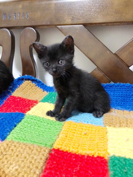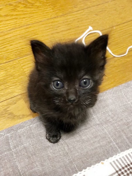 | 特徴(性格など) | 真っ黒な真ん丸顔の女の子です。甘えん坊で、人間をお母さんだと思っています。歩くとこ歩くとこ、ついてきます。膝の上が大好きです。ぜひ、キラちゃんに会いにきてください。 | ||