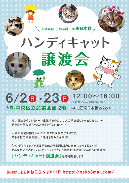 | その他(譲渡条件など) | ★仔猫ご希望の里親様★ 仔猫ちゃんたちは、まだ体がしっかりしていない赤ちゃんです。 下痢だけでも数時間対応ができなかっただけ死に至る事もあります。 その為、月齢に応じたお留守番時間を設けさせていただいております。 また、子猫ちゃん(6ヶ月未満)の里親様には子猫支援金のご協力をお願いいたしております。 ★猫ちゃんとのお見合いは譲渡会で!★ ねこざんまいの猫ちゃんは譲渡会でのお見合いのみとなります。 『この子はいつ譲渡会に参加するの?』『譲渡会場の場所はどこ?』など はねこざんまいホームページをご覧ください。 https://neko3mai.com/ ★楽しく猫ちゃんと触れ合って♪★ ねこざんまい譲渡会は、猫ちゃんも里親様も保護主も笑顔で過ごせる譲渡会を目指しています。 これから20年以上、楽しい時も、悲しい時もいつも傍にいてくれる大切な家族になる猫ちゃんです。 会場には沢山の猫ちゃんがいます。 1匹1匹、触れ合って猫ちゃんとお話ししてください。 『初めて猫ちゃんを家族に迎える方』 『先住猫ちゃんのお友達を迎える方』など トライアルの仕方や先住猫ちゃんと仲良くなるコツなど経験豊富な保護主やスタッフにお気軽にご相談ください! 猫を愛し、そして猫に愛されている猫好きスタッフと保護主がアドバイスさせていただきます。 ★里親希望のみなさまへ★ ペットではなく、家族一員としてたっぷり愛情を注いでくださるご家庭をお待ちしております。 恐れ入りますが、 ・学生の方 ・一人暮らし、同棲中の方 ・子猫、若猫希望の60歳以上のみのご家庭 ・脱走防止対策にご協力いただけない方 は原則お断りさせていただいております。 ただし、預かりボランティアさんとして新しい家族が決まるまでの間、猫ちゃんを預かっていただく道もございます。 参加猫ちゃんは、それぞれ保護主(実際に猫ちゃんを自宅に入れ、保護をしている方)が異なります。 詳しい条件なども異なる場合がございますので、会場内で直接保護主とお話ください。 〖共通条件〗 1.終生飼育 2.完全室内飼い 3.脱走防止対策へのご協力 4.避妊去勢手術 5.契約書類へのサイン 6.定期報告 7.医療費等の負担 当日の猫ちゃんを連れて帰ることはできません。後日、保護主が里親様のご自宅までお届け致します。 その為、移動の際の猫ちゃんの負担を月齢などから考慮し、お届け地区を限定させて頂くこともございますのでご了承ください。 |