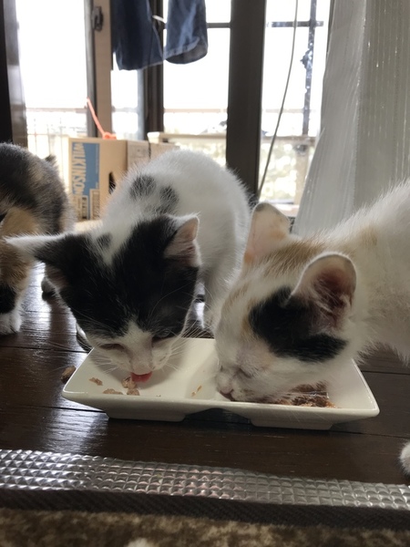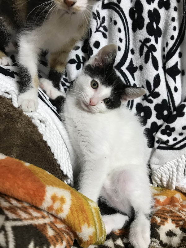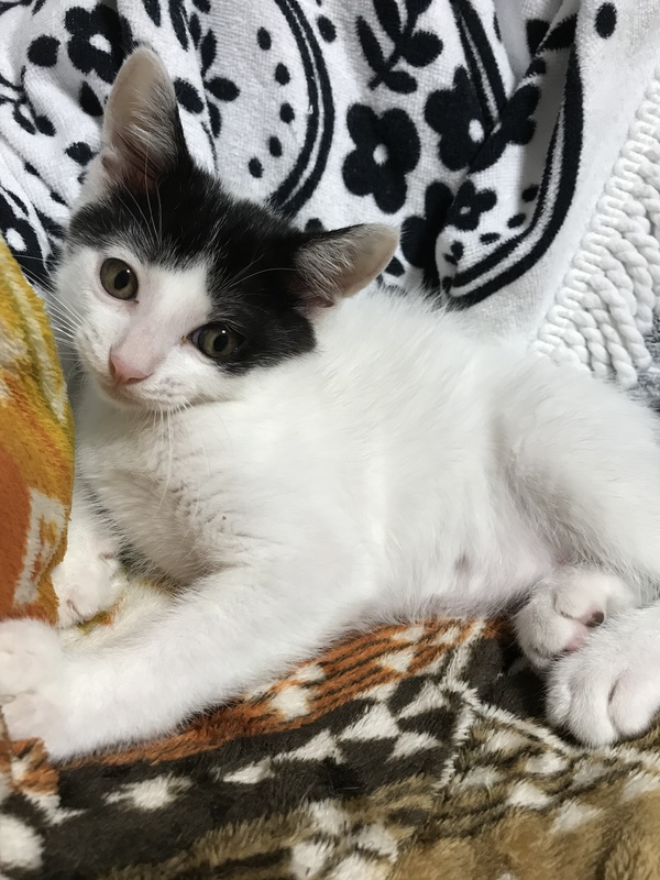 | 特徴(性格など) | 白が多めの白黒、背中のブチがオシャレです。 兄弟の中では一番大きく、元気いっぱい、予想外に可愛い声で鳴いてご飯を欲しがります。 |