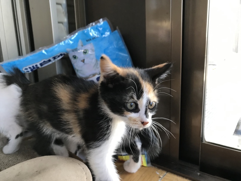 | 特徴(性格など) | 綺麗な三毛ですが、とっても味のある個性的な模様です。 兄弟のなかでは一番小柄ですが、いちばんのお転婆さん。 元気いっぱい跳ね回ってます。 |