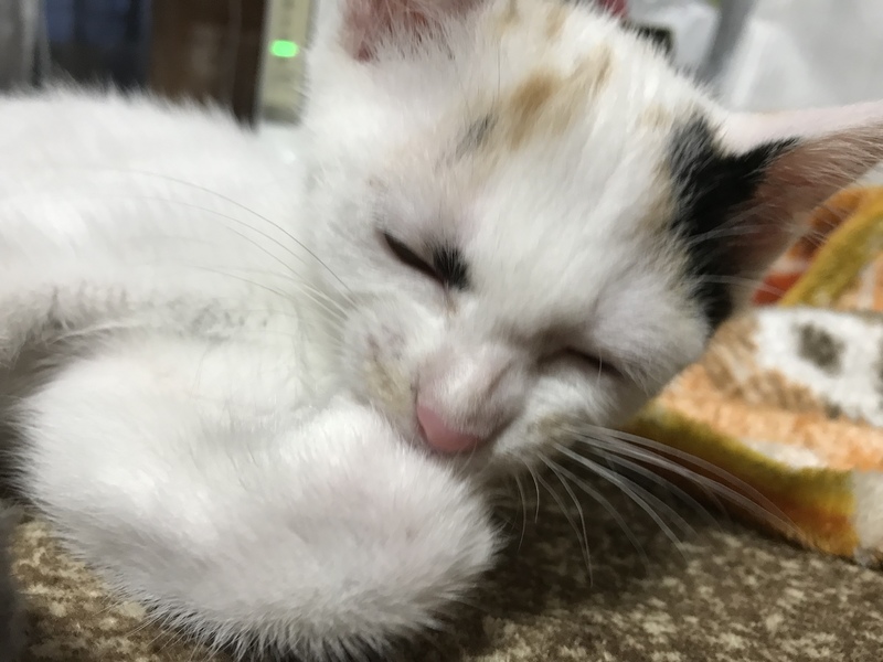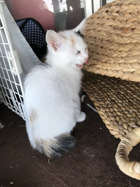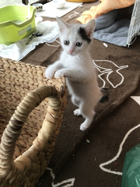 | 特徴(性格など) | ほぼ白猫ですが、耳と鍵しっぽを中心に三毛のブチがオシャレについてます。 90度に曲がった鍵しっぽは沢山の幸せを集めてくれそうです。 エイズ、白血病陰性です。 |