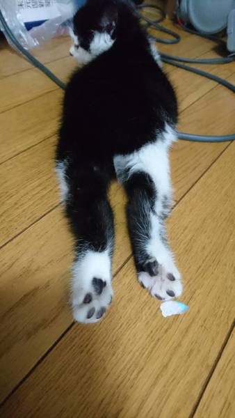 | 特徴(性格など) | ぽんちゃん(仮名)です。メス 生後約2ヶ月です。白黒に目にクッキリアイライン♡ しっぽは人の親指くらいピコピコプリプリ動きます。フワッとしたぬいぐるみ体型。 すっかり元気になり猫じゃらしと人間大好き、人慣れ抜群の可愛い子です。 初回ワクチン、蚤取り・虫下し済み。治療も終わりピカピカの健康体です!カリカリもネリネリもしっかり食べています。 |