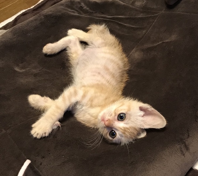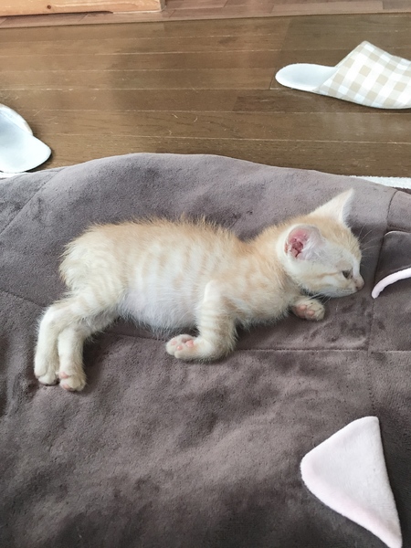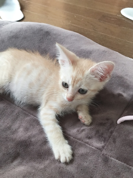 | 里親募集する理由 | 兄弟で道端で倒れて居ました。 直ぐに医者に連れて行くと猫風邪と栄養失調でした。 今はお腹がパンパンになるほど食べて元気です。 兄弟子猫は衰弱が激しく亡くなりました。 寂しくて泣いてくっついて来ます。 兄弟の分まで幸せに生きて欲しいです。 |