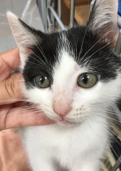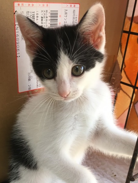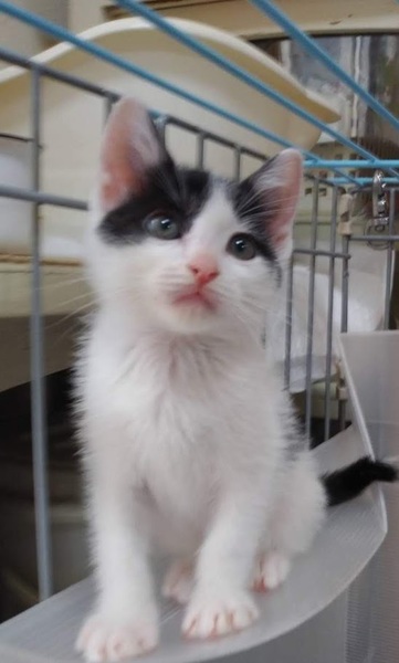 | 特徴(性格など) | 白ブチのオスです。 顔はハチワレ、体は白地にぶちがあり、しっぽは黒くて長いです。 良く遊び、よく食べて、とっても人懐っこくて元気な子です。 |