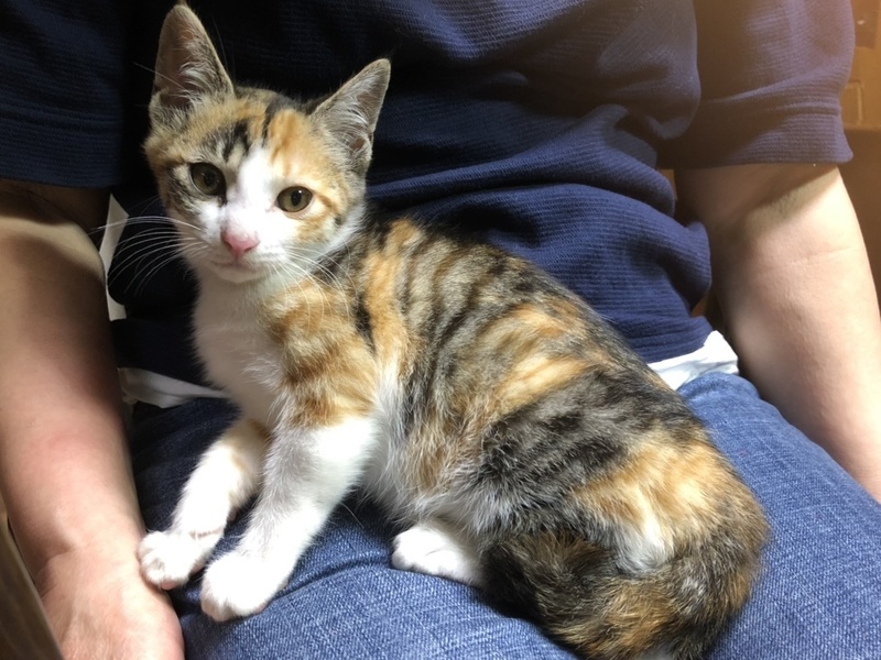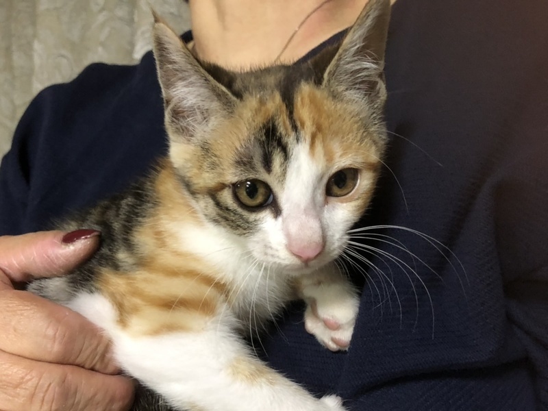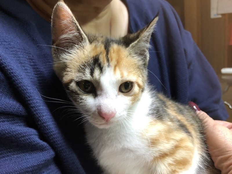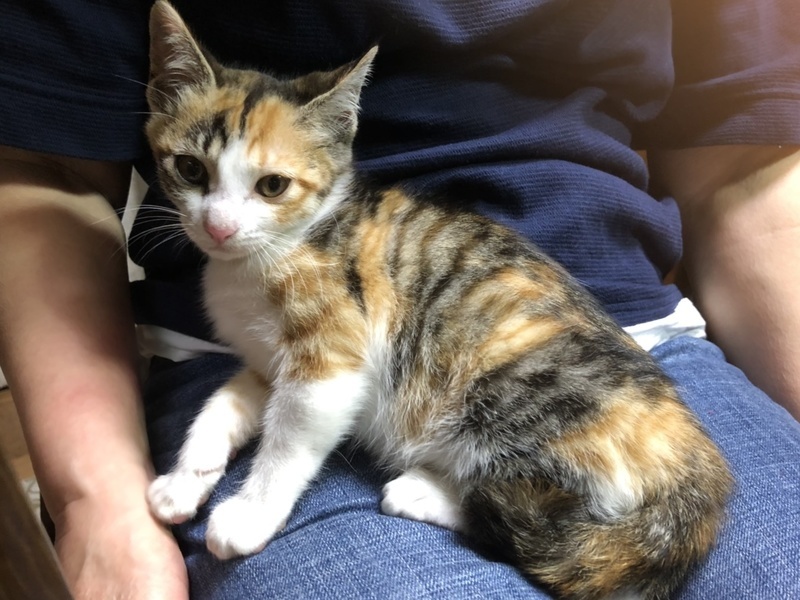 | 特徴(性格など) | 縞模様の三毛猫、名前はももです 背中全体に模様が入っています お膝の上で抱っこされたり、触られたりするのは平気 でも、大きな音や人の動きに驚いて隅っこに隠れてしまうことがまだあります 同じく保護されたきょうだいたちとは仲良く遊んでいて、 しだいに家の中の生活には慣れてきています ノミ予防済み 検便、駆虫済み ワクチン接種済み |