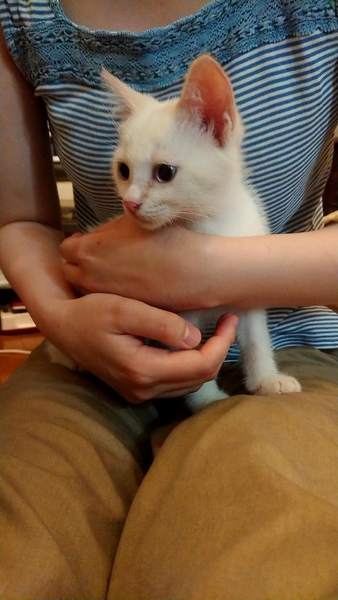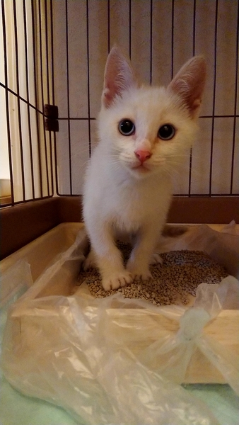 | 特徴(性格など) | 体はまっ白、尾は少しだけ茶色の混じった白。目はブルーで綺麗です。 おもちゃで遊ぶのが大好き。2~3時間遊んで2~3時間寝る、が今のサイクルです。夜は大人しいです。 |