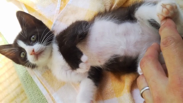 | 特徴(性格など) | 仮名:ハッチくん 月齢:生後2か月 性別:オス 毛柄:黒白ハチワレ エイズ・白血病共に陰性 ワクチン1回接種済・検便・ノミダニ駆虫済 性格:活発。人が好きで好奇心旺盛 まだ仔猫ですのでお留守番が少なく、何かあった時に夜間救急にも連れて行って下さる方、 「ペット」や「オモチャ」では無く、「家族」としてお迎え頂けるお家とのご縁をお待ちしています。 |