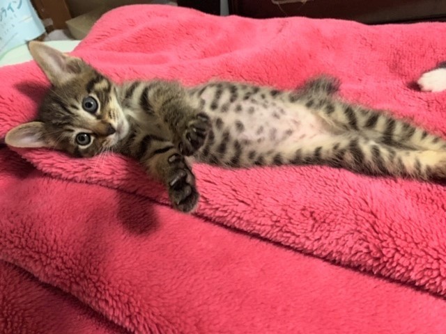 | 特徴(性格など) | 仮名:チャチャくん 月齢:生後3か月 性別:オス 毛柄:キジトラ エイズ・白血病共に陰性 ワクチン1回接種済・検便・ノミダニ駆虫済 性格:マイペース、やんちゃで甘えん坊 まだ仔猫ですのでお留守番が少なく、何かあった時に夜間救急にも連れて行って下さる方、 「ペット」や「オモチャ」では無く、「家族」としてお迎え頂けるお家とのご縁をお待ちしています。 |