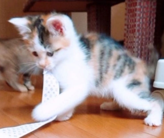 | 特徴(性格など) | ◎三毛♀️男子に劣らぬお転婆娘! →※男の子に負けない位お転婆さんです。お遊び大好き。人慣れもオッケーです。 もう一匹のキジのカイトくん情報です。 →◎キジ♂怖がりの甘えん坊 ※べったり甘えん坊さん。お遊び大好き。 キジトラのカイトくんのページも併せてご覧くださいませ。 ※兄妹なので2匹で飼われることをお勧めします。 |