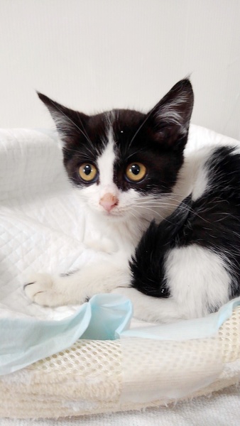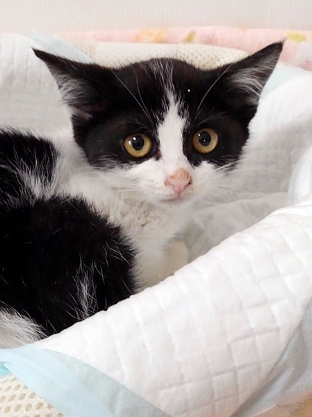 | 特徴(性格など) | 【仮名】幸 【性格】 黒白ハチワレ 最初は緊張で固まっていましたが、威嚇行動は全くなし。 保護して数日ですが、だんだん人慣れしてきました。 抱っこもできます。 ケージによじ登って活発に動いてます。 姉妹猫「福」と生まれてから離れたことがないので、2匹でのお迎えを希望します。 |