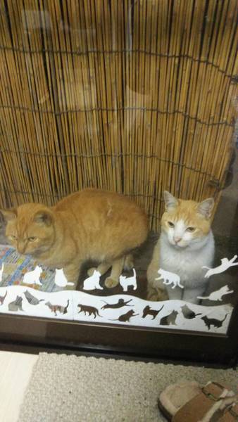 | 特徴(性格など) | 兄弟とっても仲良しです。穏やかで他の猫に威嚇することもありません。 ★茶トラの子 おとなしくて甘えん坊。人にすり寄ってきながら、小さい小さい声で鳴きます。 迷い込んできたとき、尻尾にひどい怪我がありました。病院で診察のうえ尻尾の切断手術を受け、順調に回復しています。 ★茶トラ白の子 同じく甘えん坊で人が大好きです。茶トラの子よりやや大きめで性格も積極的。 |
