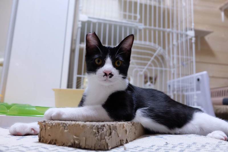 | 特徴(性格など) | 細身の白黒で、とってもやんちゃです。 兄弟のつばめ君たちと毎日走り回っています。 ちょっと天然なところがあります。べったりではありませんが、甘えたです。 |