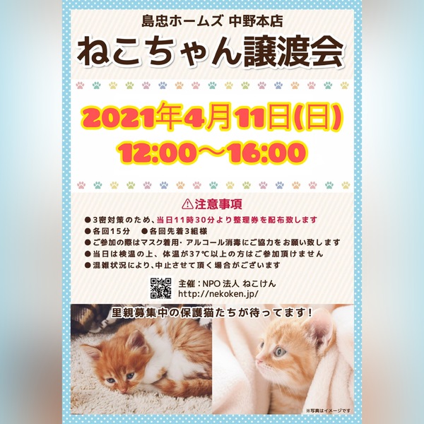 | その他(譲渡条件など) | ペットとしてではなく、生涯家族として猫を迎えて下さる方への譲渡となります。 原則ねこけん譲渡会等でのお見合いにてお申込みをお願いしております。 ◆猫さんたちとのお見合について◆ 「ねこけん譲渡会」or「完全予約制個別お見合い」で気になる猫さんと会えます♪ 現在ねこけん譲渡会「虎ノ門会場」および「練馬会場」での定期開催は自粛しております。 2020年11月より島忠ホームズ中野本店および仙川店にて譲渡会を開催しています。 譲渡会には家族を待っている猫さん達がたくさん参加します♪ 募集サイトに掲載のない猫さんも参加します。 家族としてお迎えいただく猫さんです。 実際に会って、よ~く考えてから決めて下さい! ★毎月第2日曜日 12:00〜16:00 島忠ホームズ中野本店 〒164-0014 東京都中野区南台5-24-13 https://www.shimachu.co.jp/shop/tokyo/310.html (注)中野店ではなく中野本店での開催です。 ※当日11:30より整理券を配布。(各回15分、各回先着3組様) ★毎月第4日曜日 12:00〜16:00 島忠ホームズ仙川店 〒182-0003 東京都調布市若葉町2-1-7 https://www.shimachu.co.jp/gmshop/tokyo/313.html ※当日11:30より整理券を配布。(各回15分、各回先着3組様) 譲渡会等イベント開催日程・詳細は、イベント一覧よりご確認ください。 ▼△▼イベント一覧▼△▼ https://satoya-boshu.net/event/?@button_name@=search&Event_MemberID=1288 ※事前のご予約などは必要ございませんので、ご家族皆様でぜひお越し下さい。 ※掲載中の猫さんであっても、当日の体調などにより譲渡会を欠席することがあります。 ◆必ずお守り頂く事◆ ①終生飼養 ②完全室内飼養 ③年1回のご報告 ④ペット飼育可能な物件にお住まいであること ただし、以下の該当の方は、譲渡出来ない場合がございます。 ※学生、安定的な収入のない方 ※60歳以上の方は、成猫さんを家族に迎え入れることが出来ます。 里親様のご年齢に応じた成猫の譲渡となりますのでご相談ください。 ◆譲渡費用について◆ 不妊去勢手術・医療費の一部負担をお願いしております。 お届けエリアによっては往復高速料金(実費)を別途ご負担いただく場合がございます。 なお、交通費に関しましては正式譲渡に至らない場合であってもご返却できませんので予めご了承下さい。 ・ご希望の猫さんと家族になるまでの流れ ・譲渡時にかかる一部ご負担金などの詳細 ・譲渡契約書のサンプル等 下記URLに掲載しておりますのでご確認ください。 https://nekoken.jp/jotokai/joto-nagare/ https://nekoken.jp/jotokai/joutokibou/ ◆引き渡し方法◆ 必ずご自宅まで猫さんをお届けさせていただきます。 1週間程度のトライアル後、正式譲渡となります。 ◆お届け可能エリアについて◆ 応募可能県内であっても、遠方の場合アフターフォローの関係上お断りさせていただくことがございます。 ご心配な際は、前もって市区町村名や最寄り駅等をメールにてお問い合わせいただけますと幸いです。 お手数をおかけいたしますが、何卒ご了承くださいますようお願いいします。 ※譲渡会日程がご予定と合わず個別お見合いご希望の方は、各募集サイトからのご応募もしくは下記連絡先までお問い合わせください。 [連絡先] ご質問等ございましたらお気軽にお問い合わせください。 NPO法人ねこけん東京本部 https://nekoken.jp/inquiry/ nekoken@cat.email.ne.jp [ホームページ] https://nekoken.jp [Instagram] https://www.instagram.com/nekoken2222/ [ブログ・ボラ日記・YouTubeなど] https://linktr.ee/nekoken フォロー・チャンネル登録よろしくお願いします! |
