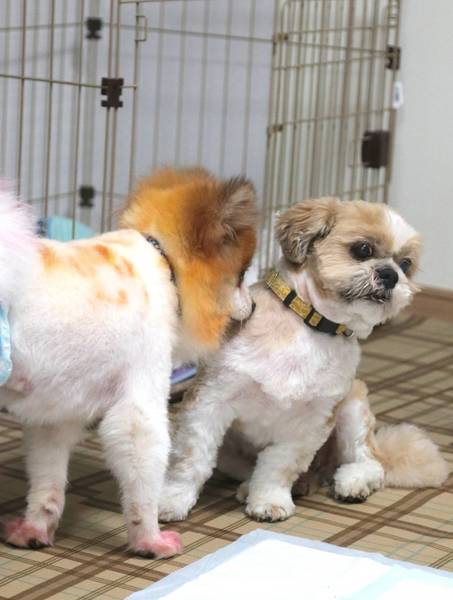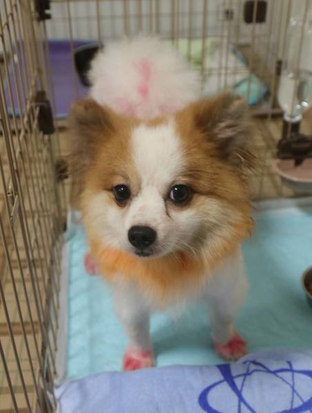| 特徴(性格など) | ポメラニアンの男の子、パレットくんです。 とってもかわいいお顔をしています。 被毛の色は~染められておりまして~ 足先は赤、背中はオレンジですが… パーティーカラーです。 5,52キロのデカポメサイズです^^ ボサボサでしたので、シャンプーカットしました、 蒸れていたので、皮膚炎をおこしており、治療しました。 保護して日が浅いのですが、 初対面から、しっぽフリフリの愛嬌よし もう少し若いのか、遊んで~と誘ってきます。 まだまだ甘嚙み太郎でして、なでてやろうとしても、くねくね甘嚙みしてきます。 かまってちゃんです。 他の犬にも。グイグイです^^ |