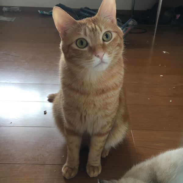 | 特徴(性格など) | 明るいオレンジ系の色です。 アメショミックスのため体の横に特有の渦巻き模様があります。 |