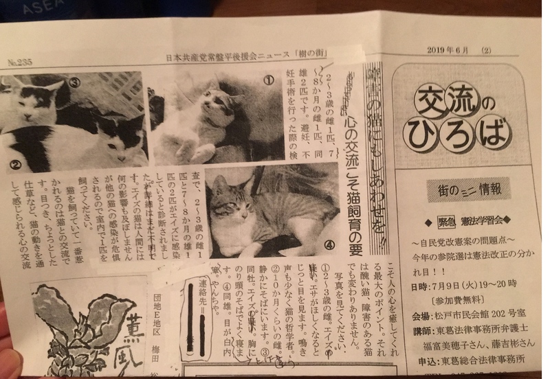| その他(譲渡条件など) | 住環境、身分証明証を確認させていただけるかた。 ・必要な医療を受けることができるご家庭 ・写真、手紙などで近況報告いただけるかた。 エイズは人間には移りません。 ほかの猫に感染する可能性があるため一匹のみで迎えてください。 他の投稿で、兄弟猫の里親募集をしていますが、エイズの子同士で迎えることは問題ありません。 完全室内飼いをお願いします。 外での過酷な暮らしにも耐え前向きに懸命に生きている姿には勇気づけられ その愛らしい魅力は いつでも心を癒してくれます。 一生涯大切にしてくださるかた、 どうか宜しくお願いいたします。 ※恐れ入りますが、 カップル、60歳以上のかたはお断りしています。 一人暮らしの方は、 病気などでやむを得ず世話が出来ないときに代わりに世話ができる方がいる場合のみ譲渡可能です。 ご質問、ご相談がありましたらお問い合わせください。 ★共産党 広報「樹の街」に掲載されている紙面もあわせて公開します。 |