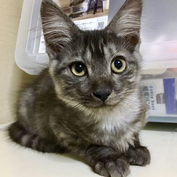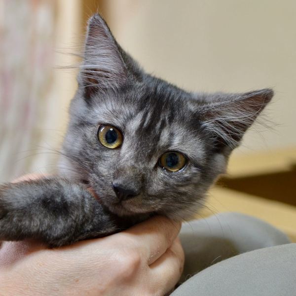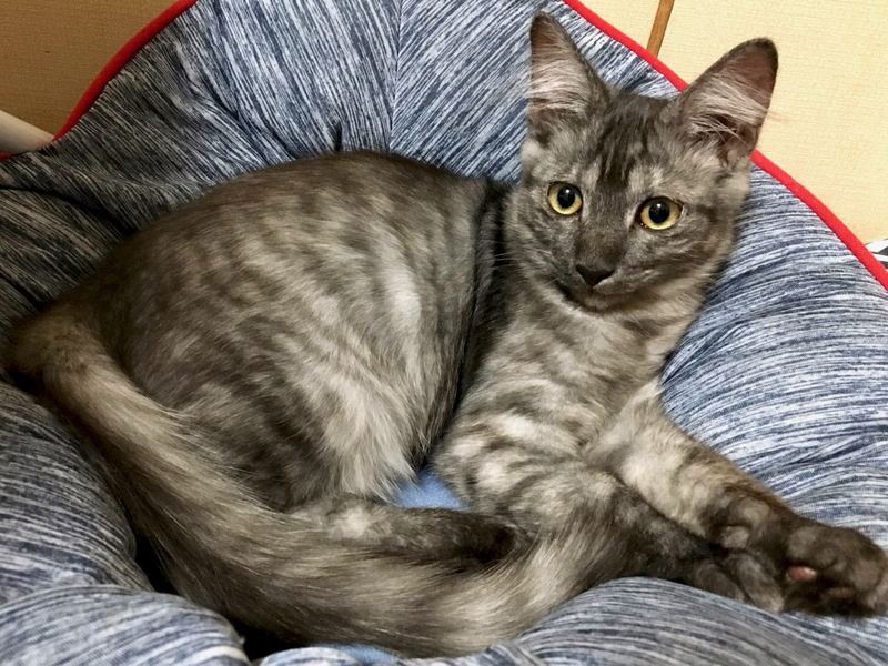 | 特徴(性格など) | 仮名:テトくん 毛色:サバトラ(薄い縞模様)半長毛 体重:2.1キロ(8/17測定) ウイルス検査:エイズ・白血病とも陰性 3種ワクチン:7月14日に1回目、8月17日に2回目接種済 プロフェンダースポット済(お腹の虫駆虫済) フロントラインプラス済(ノミダニ取り済) 検便:キャンピロバクター(5日間抗生剤投与済)、コクシジウム駆虫済 グレーにもこげ茶にも見えるふわりとした半長毛。 薄い縞模様があり、パステルサビ柄?にも見えます。 長めの被毛に長い尻尾、大きなお耳と愛嬌あるクリクリお目目が特徴のテトくん。 保護した3兄弟の中で人や場所に馴染むのも一番、おもちゃで遊ぶのも一番だった賢いテトくん。 留守番や寝る時はケージで過ごしていますが、室内に放牧すると一人でも飽きる事なく元気に遊び続けます。 トイレのしつけ済、ドライフードも好き嫌いなくよく食べます。 初めて猫を飼育なさるご家庭でも問題なく飼育可能な子猫ちゃんです。 6月下旬に保護して約2ヶ月が経ち、健康状態は良好、人馴れも進んで可愛い盛りです。 現在の保護場所が手狭になってきているため、なるべく早く里親さんを見つけてあげたいと思っています。 テトくんのほかに、同腹の兄弟、白黒ハチワレパンダちゃん、テトくんと同柄のチョコくんがいます。 できることなら、2匹を一緒に引き取ってくださることを検討していただけると嬉しいです。 (もちろん、テトくんだけのご希望でも構いません) |