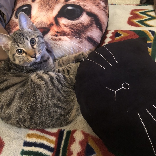 | 特徴(性格など) | ひとなつっこく、警戒心があまりありません。 愛される子です。友人達にもすぐ愛でてもらうくらい可愛い子です。 鳴き声も少なく小さく、名前を呼ぶと初日から返事をしてくれました。 寝るときもひっついてくりはことが多いです。 その反面、自由で気まぐれです。 届かない すみに隠れたりはしないですが、自分一人で自由にだらけもします。 親(現在は私)以外にはよく腕にしがみつき甘噛みしてじゃれます。 こちらが手にして遊ぶおもちゃには反応がよく、一生懸命遊びます。 似た柄の子はよく見かけますが、すごくオリジナリティー溢れる子です。 瞳は黒あるいは黄色です。 なかば 元親様の強引さに負けて、選択の余地も猶予もなく、受け取りを拒むのは ねこさんが可哀想で引き取って以来から現在まで、健康そのものです。 多種なドライごはんからちゅーるなどのウェットおやつ全般まで なんでも食べてくれます。ちゅーる系は何でもだいすきです。すごくがっついてきます。 |