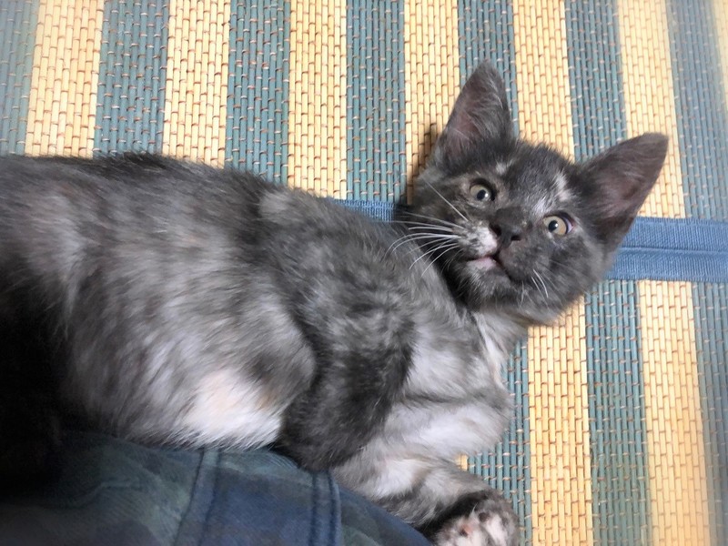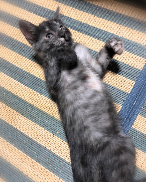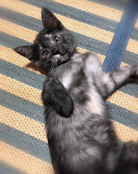 | 特徴(性格など) | わんこ顔のスモークカラーサビ女の子。 認識力の高いお利口さんで、特においしい柔らかご飯をくれる人に一途です。 マイペースな性格で、甘えたい時は隣りでコテンと横になりお腹を撫でて~と、こちらをじっと見つめて来ます。 他の描とも仲良く過ごせる子です。 |