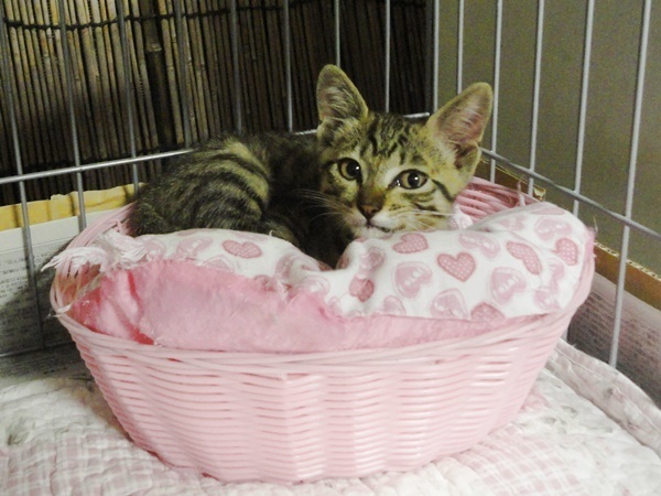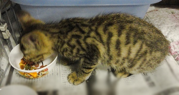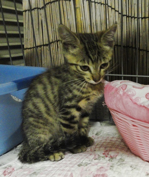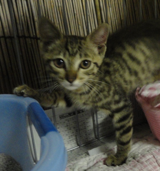 | 特徴(性格など) | ■キジトラ:瞳は大きく褐色に近いカッパー、毛は夏毛のため短い、しっぽは長い ■食欲旺盛:やせっぽちですが、保護してからはで、ウェット、ドライ、どちらもよく食べています ■健康状態は良好:目ヤニ、鼻水、下痢はありません。立派なうんちで、寄生虫も見られません ■トイレもきちんとできます ■レボリューション済 本日、保護したばかりですので少し警戒はしていますが、顔を見るとゴロゴロおと大きな音で喉を鳴らします 手を伸ばすと、後ろずさりしますが、カラダに触れても怒りませんし、なでることも抱くこともできます |