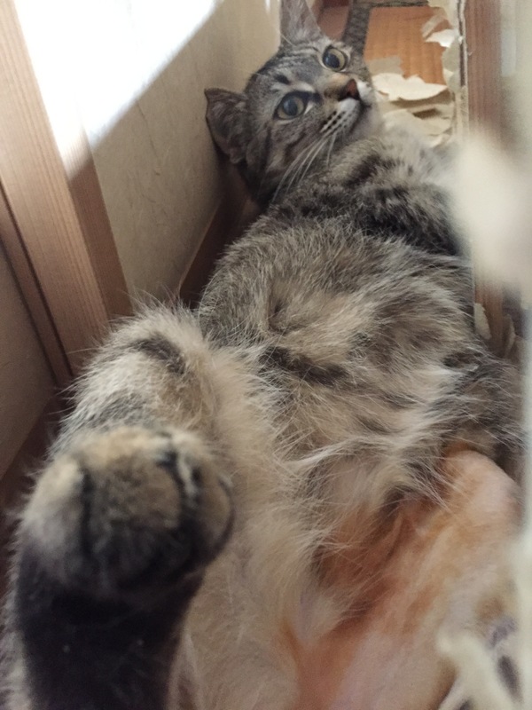 | 特徴(性格など) | キジトラ、控えめだけど甘えん坊、見つめてくる視線はキラキラ、抱っこして撫でると短い声でニャッとなく。とにかくかわいい!! 後ろ足脱臼手術をしたため、足を引きずりますが、屋内にての生活に問題はありません。前足、怪我のため一部切除。それも日常生活に支障は無し。白血病陰性 エイズ陰性 検便異常無し |