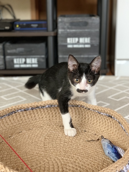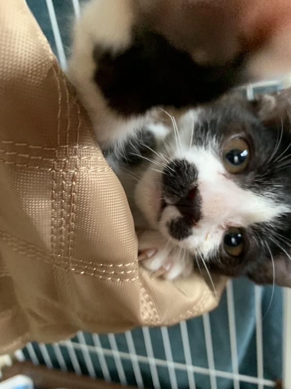 | 特徴(性格など) | 保護した時は、パニックになり暴れました(そりゃそうですよね。巨人(人間)に捕まえられたんですから)。 保護してから2時間後くらいには、フミフミスリスリしてました。 白黒でちょび髭、尻尾が短いです。でもプリプリよく振りますよ。 |