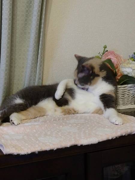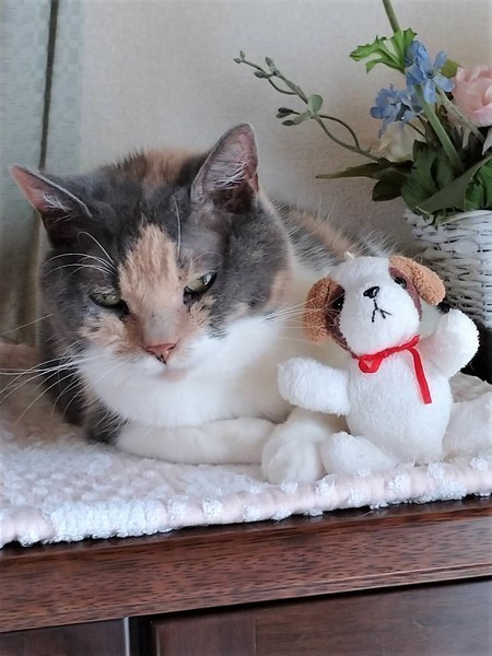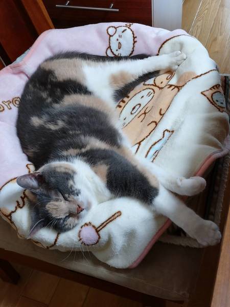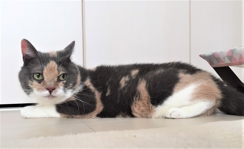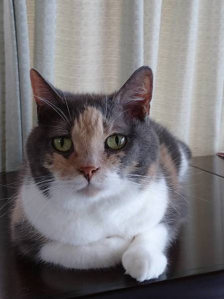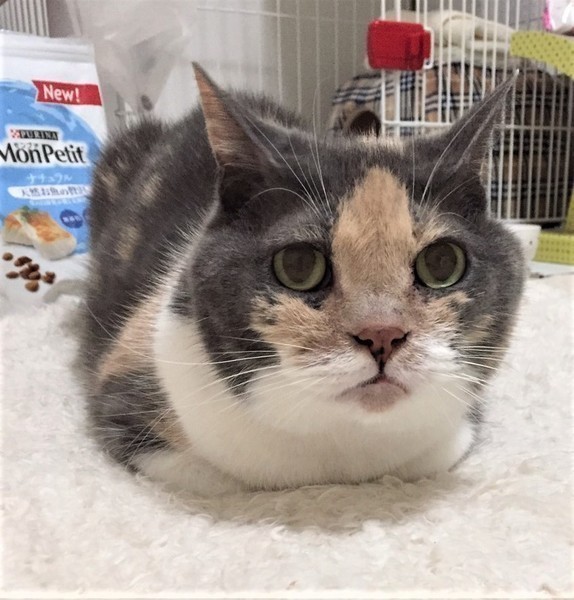 | 特徴(性格など) | 仮名: みいちゃん(メス) 毛色: 黒部分が少しグレーの三毛、スコティッシュホールドです。 性格: 10歳ですから、性格も生活スタイルも出来上がっているので、頑固な部分もありますが、(今は動きたくない)とか(ここで寝る)とか、結構、単純な事に頑固なので、掃除の時に動かなかったり、保護主と寝ると決めたら、どかなかったりします。普通は落ち着いて過ごしていますが、元飼い主と二人っきりだったし、一人で留守番も長かったので、先住猫がいる暮らしは、落ち着くのかどうか、わかりません。 現在は、保護主宅に猫がいますが、若いのが遊ぼうといきなり近寄ると怖いようです。 落ち着いた子が近くにいるのは、気にならなくなったようです。 検便済 駆虫済 3種混合ワクチン済 猫エイズ・白血病ウィルス検査はともに陰性です |