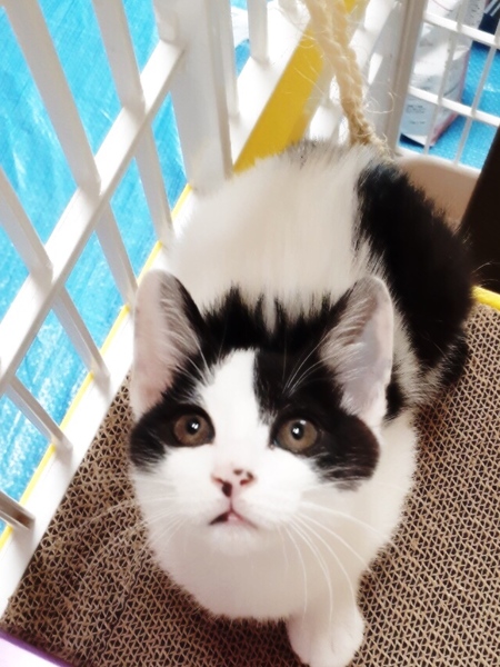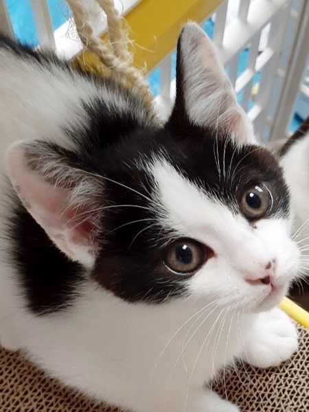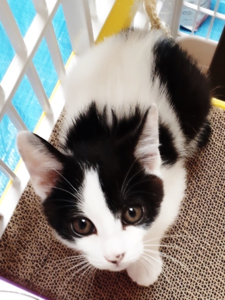 | 特徴(性格など) | 歌舞伎の隈どりのような白黒です。 一緒に保護した兄妹の女の子と比べ、遊び方も性格も控え目です。 おっとりした性格です。 大人猫と一緒にいますので、猫に慣れています。保護して家族と一緒に世話していますので、人にも慣れています。 |