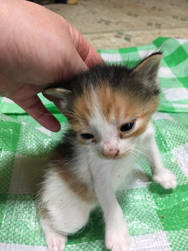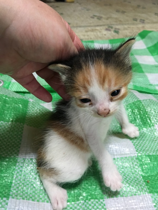| 特徴(性格など) | 三毛ちゃん 可愛い ウェットフードを食べています。トイレで排泄できます。 まだ病院に連れていっていませんが健康のようです。 ノミ駆除済みです。 |