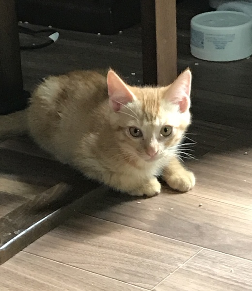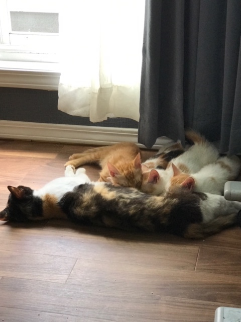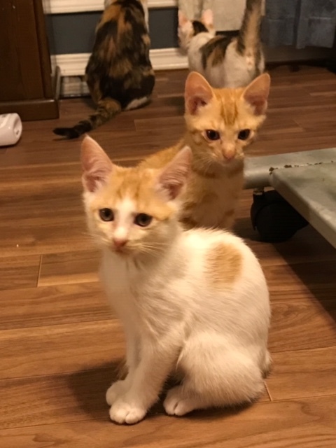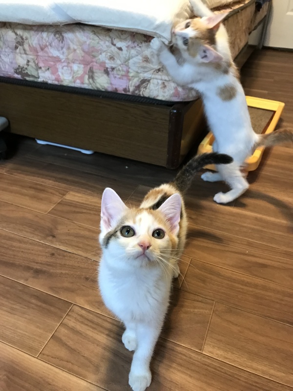 | 特徴(性格など) | 生後3ヶ月くらいのオス(茶トラ、茶白)メス(三毛、茶白)4匹。 2ヶ月半くらいまで屋外で外猫の母猫に育てられていたため臆病なところがまだあります。 保護時は猫風邪で目が充血し涙目だったのですが、投薬で改善してきれいな目になりました。 おもちゃで遊ぶと喜んで部屋中を飛び回っています。 とても元気な4兄弟です!(^^)! |